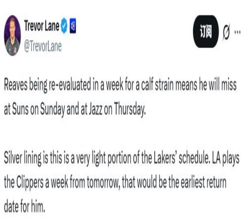 受NBA杯的影响,湖人未来一周只有两场比赛,分别是12月15日客场对阵太阳以及12月19日客场对阵爵士。如果里夫斯能在一周后回归,他预计会缺席这两场比赛。他最快可以在下周对快船的比赛中复出。