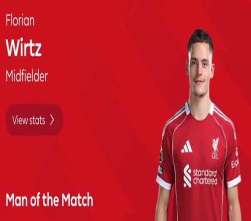 英超第18轮,利物浦主场2-1击败狼队,此役斩获利物浦生涯首球的维尔茨当选全场最佳球员。